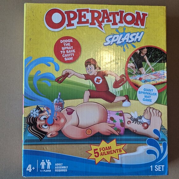•OPERATION SPLASH. Includes 1 Operation Splash Game mat (25 x 45 inches), sprinkler nose with integrated timer, 5 differently shaped foam ailments, giant tweezers, and a lifesaver ring. Adult supervision is recommended. Ages 4 and up.