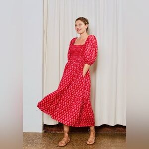 Red base, pink hydrangea block print, smocked bodice with frilled edge, puff sleeve, elastic cuff, midi length, pockets.