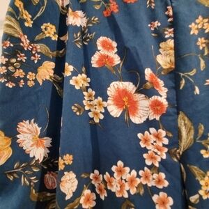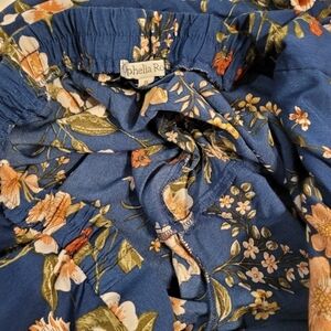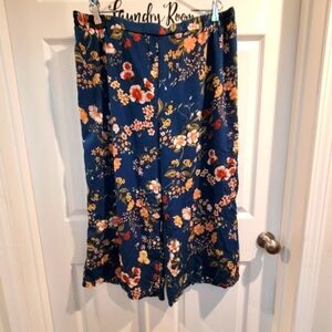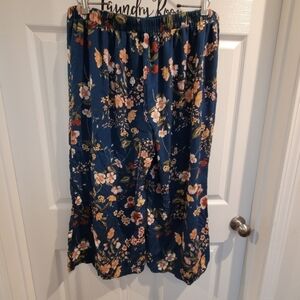 100% polyester. Elastic Waist. Navy Blue with a floral print. Excellent condition. Size 1X. Please compare measurements to something similar to ensure fit.