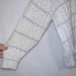 Ophelia Roe Fuzzy Eyelash Knit Cream Purple Glitter Stripe Mock Neck Sweater