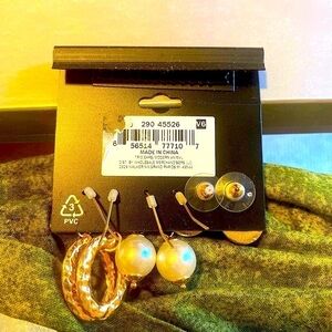 Three pairs of earrings to coordinate with any outfit. One pair of oval tortoise shell post earrings, one pair of dangling faux pearl earrings, and one pair hammered metal oval dangling earrings. Hypoallergenic posts.