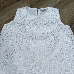 This sleeveless white dress features a classic A-line silhouette with a crew neck, perfect for a wedding guest or casual occasion. The intricate eyelet pattern and scalloped hem add a touch of elegance to its fresh, summery aesthetic.
