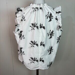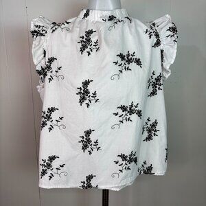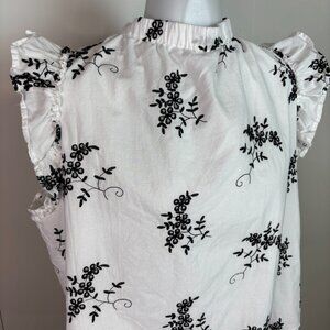 Ophelia Roe Top XL White Black Embroidered Flutter Sleeve Cotton Blouse Women's