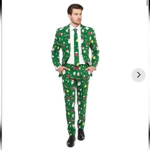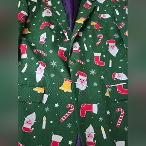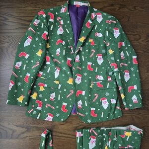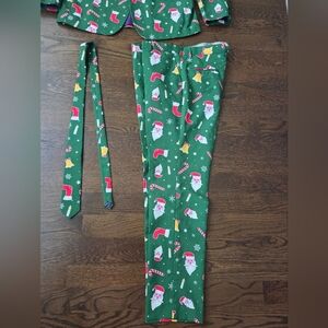 Vibrant green suit set with Santa and holiday motifs. Includes jacket, pants, and tie. Perfect for festive occasions.Worn once.
