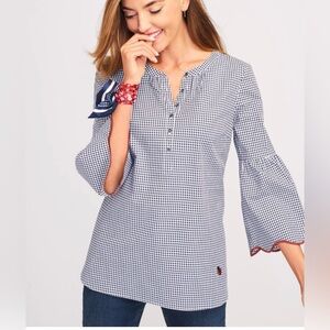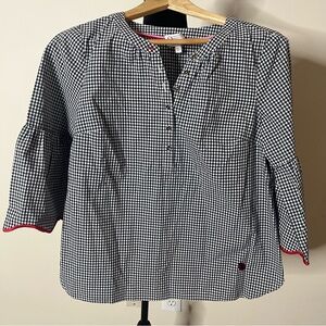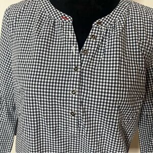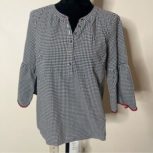 Women’s Oprah Magazine Collection for Talbots black and white gingham popover tunic top featuring split neckline, half button placket,feminine long flounce sleeves with red contrast scalloped embroidery, embroidered ladybug on hem size medium petite MP