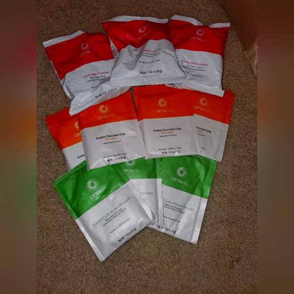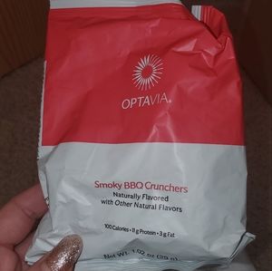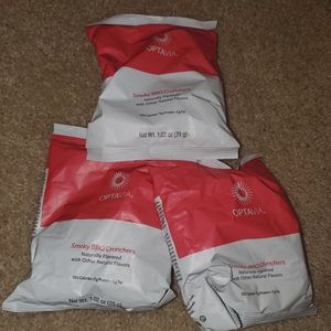 Optavia 4 golden chocolate chip pancakes, 3 barbecue crunchers, and 3 garlic mashed potatoes.