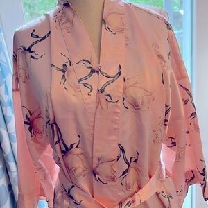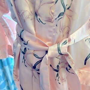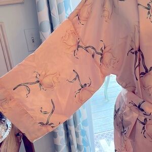 Here is a Opulent Pink Floral Rose Kimono Sytle Satiny Wrap Robe in EUC