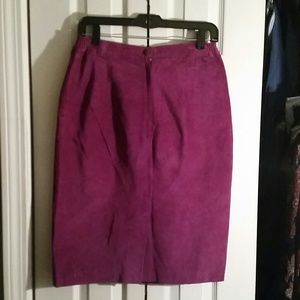 Lush suede pencil skirt, with back slit, elastic at sides of waist, zip and snap closure.