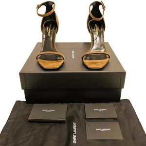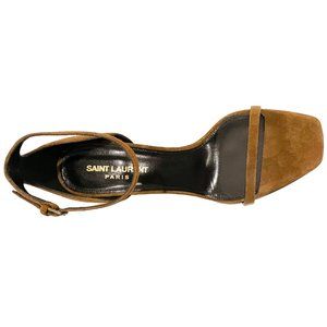 Brand New, 100% authentic Saint Laurent Opyum 85 YSL Logo Heel Sandal on Brown (Land) suede leather. EU size 35 (US size 5B)