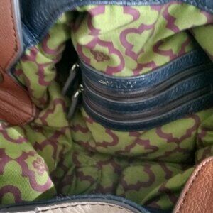 orYany Blue/Tan/Brown Colorblock Hobo Women's Crossbody Bag.Measurement 13.5"X15.5"X2 with a 5.5 handle drop and 18.5 strap drop.This beautiful bag very roomy and soft leather.Adjustable shoulder strap, 2 zippered front pockets,top magnetic snap closure, hanging name plate and signature print inside, pre-owned good condition.
