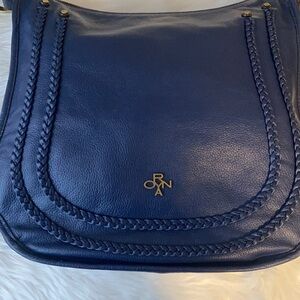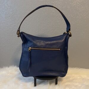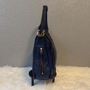Soft pebble leather hobo purse from orYANY. Beautiful braiding details in a rich dark blue color, very on-trend for fall. Single strap with a top zip closure and an exterior back zip pocket. Signature lining and antiqued gold-tone hardware. Excellent pre-owned condition. Some minimal scratches and signs of wear on bottom and corner edges as shown in pictures. Reasonable offers welcome!