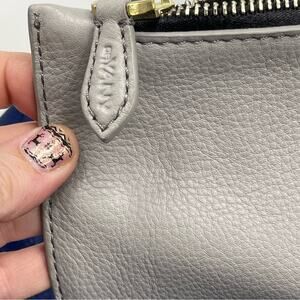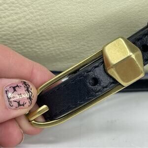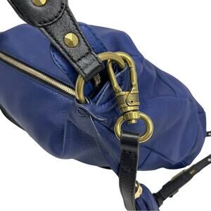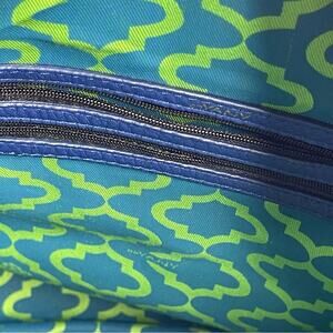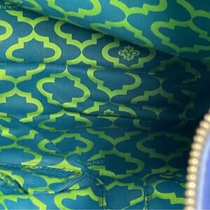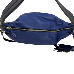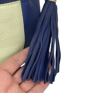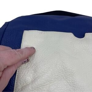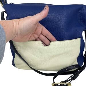 Item in Excellent Preowned Condition. Appears unused, Clean inside & out, Yiny spot shown in photo, Brass hardware, Luxury pebbled leather, Accent tassel, Front phone pocket, Cloth lined interior, Three interior pockets one with zipper, Second matching makeup bag / accessories bag. Royal Blue / Cream