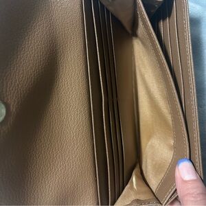 Has gold hardware and slots for credit cards. 100% genuine pebble leather. Used but in excellent condition.