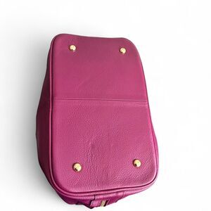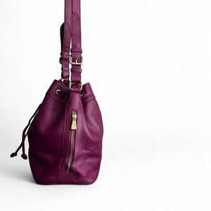 berry magenta, pebbled leather, bucket shape, adjustable strap, gold hardware, drawstring closure, roomy interior, side zip pockets, soft leather, mid-2010s