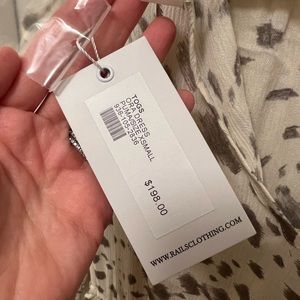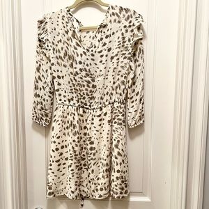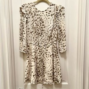 Abstract print mini-dress with ruffle detailing at shoulders and a comfort elasticized waist.