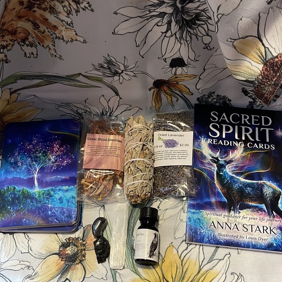 This kit comes with Sacred sSpirit oracle deck, booklet, wisdom oil, sage, lavender, cedar shavings, selenite, hematite, and black tourmaline. This deck has beautiful artwork, a great feel while shuffling and is a very gentle read. Great for beginners AND expert readers.