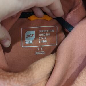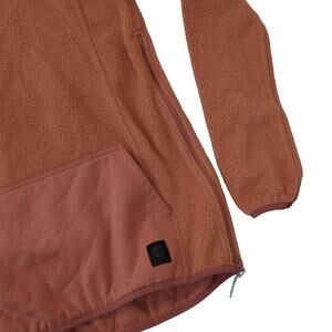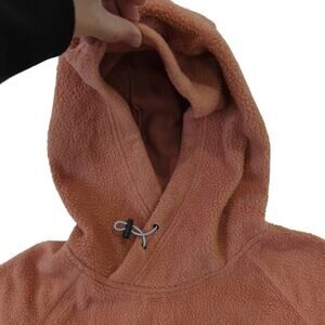 orage women's fleece hoodie jacket size small kangaroo pocket zipper side 100% polyester pink long sleeve least sweater long line fitted