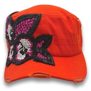 Orange Army Cadet Hat Flower Beaded Sequins Round Top Distressed BDU Castro Cap