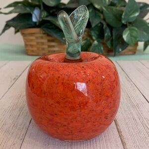 Orange Art Glass Weighted Apple Paperweight With Clear Green Stem Leaf.