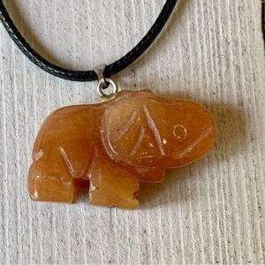 Orange Aventurine Carved Crystal Lucky Elephant Trunk Up Pendant Necklace with 20" adjustable cord chain.