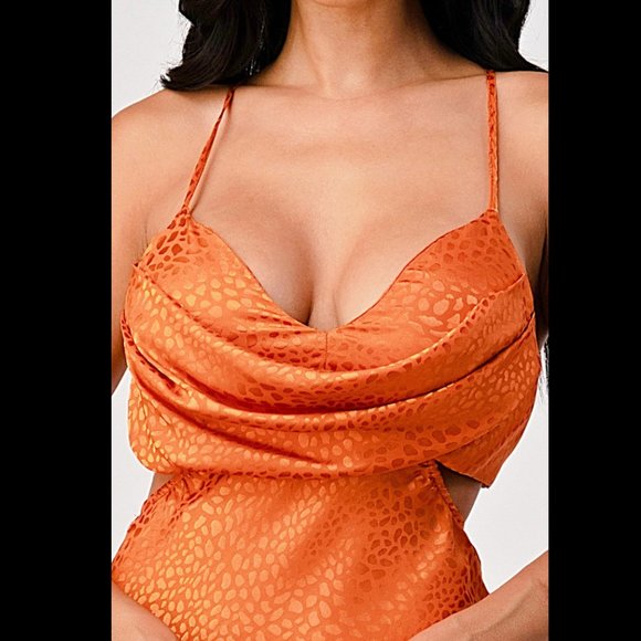 This dress is perfect for a night out! The midi length and cowl neck make it stylish and elegant, while the cutout and jacquard satin fabric add a touch of glamour. You'll love the way you look and feel in this dress!