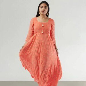Shine in an orange Banarasi georgette Anarkali dress adorned with gold butta. Ideal for celebrations, it adds a vibrant flair to your festive wardrobe.
