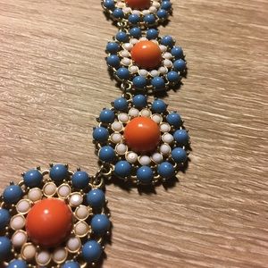A beautiful, bold statement necklace to add some color to a simple outfit. 7 decorated disks adorn the necklace with brilliant blue, orange, and white beads. The clasp needs to be fixed (either by adjusting the opening) or replaced.