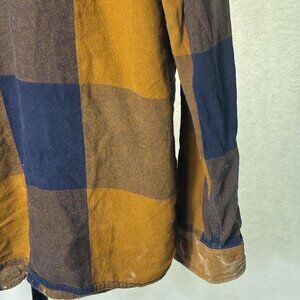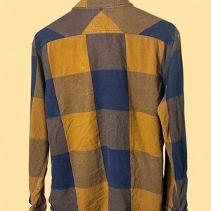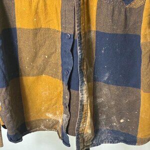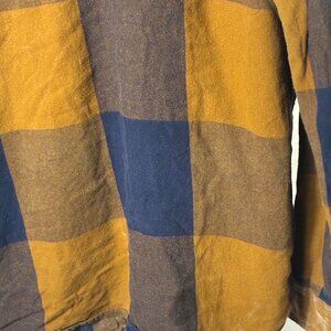orange brown, blue plaid, vintage flannel, distressed, oversized, grunge, retro, casual shirt, button-up, streetwear