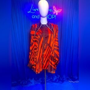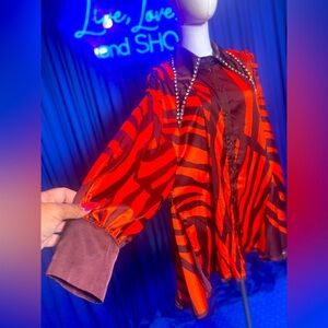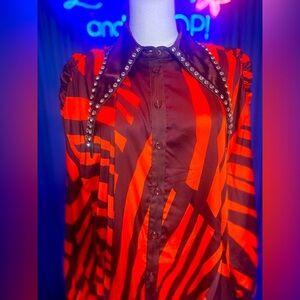 Unleash Your Wild Side with this gorgeous exotic Zebra Print and Rhinestone Blouse; where wild patterns meet dazzling sophistication.