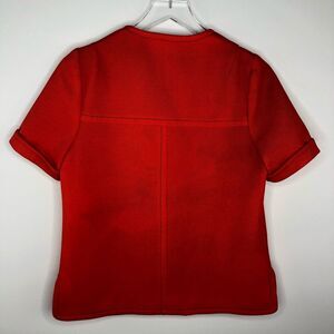 Vintage vibrant red orange blouse, v neck, gold buttons, cuffed sleeve, true pockets on front. No size or brand tag. Please use measurements as a guide to fit.