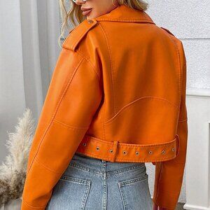 Orange Casual Women's Minimalist Zip Up faux leather Cropped Jacket