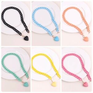 Chunky acrylic chain necklace with t bar and dangling heart. Colors have a smooth matte finish. Collar necklace. Top of the heart is a little damaged. See last picture