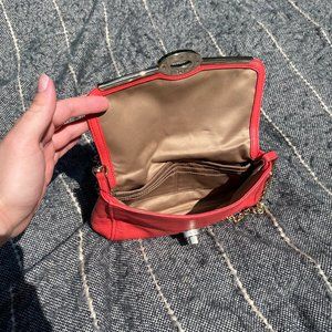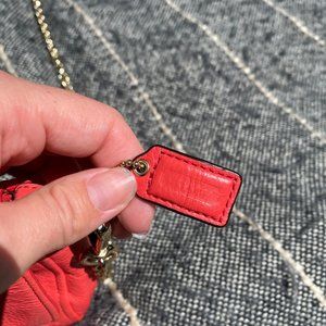 A gorgeous orange, leather purse from Coach! The gold chain strap is detachable, so it can be carried as a clutch or with the strap as a crossbody bag. It has a turncock closure. The interior is a nice neutral beige color, with credit card holder slots and a smaller inner pouch. No stains!