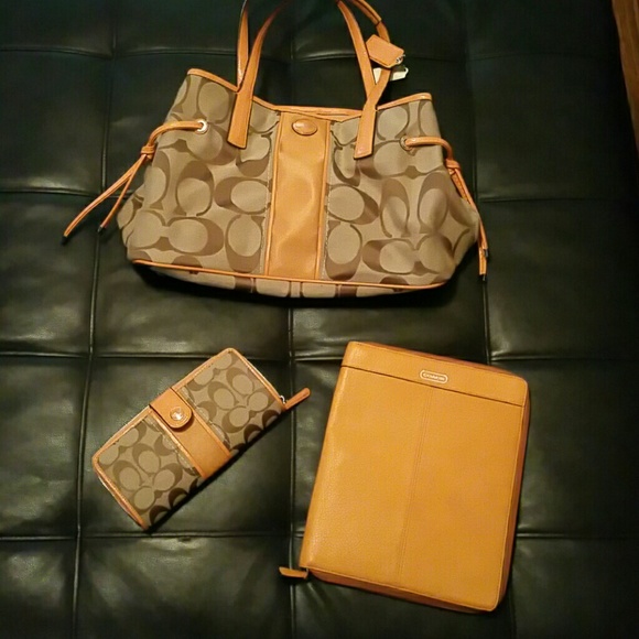 Large coach purse tan with orange trim condition 9 out of 10. Matching coach wallet condition 10 out of 10. Coach iPad cover for older generation iPads outside condition 10 out of 10 inside needs some cleaning.