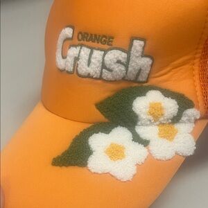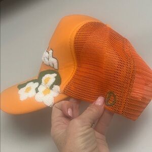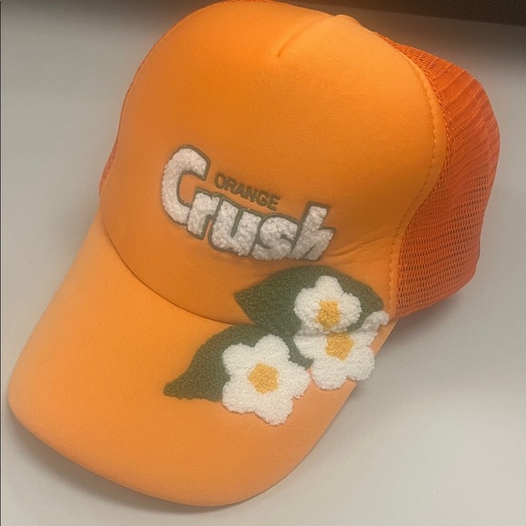 Add a pop of color to your look with the Women's Cap. This vibrant orange hat features charming floral details, perfect for sunny days. Trucker hat, logo drink company. In excellent preowned condition. From a smoke free home.