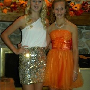 Orange XS strapless homecoming dress. Very comfortable to dance in & did not fall down. Worn just once & originally purchased off of Promgirl.com.