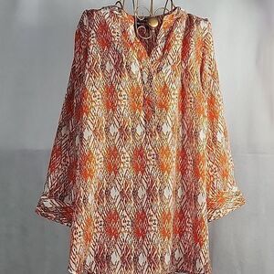 Mandarin neckline, hidden button plaqutte, 3/4" sleeves with button detail, vibrant colored diamond patterned tunic, size L