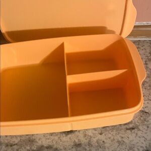 Bright orange lunch box with divided compartments. Perfect for meal prep and portion control. The 1L