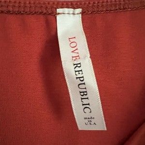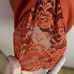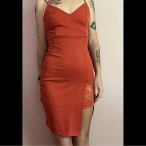 Beautiful burnt orange / pumpkin spice warm fall color dress. Side slit with a layer of floral lace underneath. It i has a tailored fit on top with spaghetti straps and is more of a midi length but the slit makes it feel more like a mini.