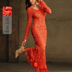 Orange Elegant Women's Sequined Crochet Long-Sleeve Dress