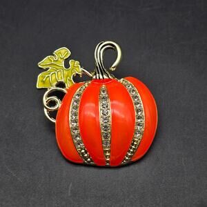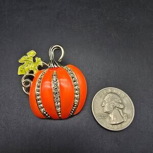 Orange Enamel Pumpkin Brooch with Rhinestone Details Autumn Fall Thanksgiving