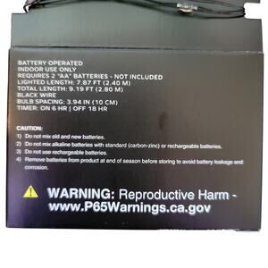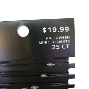 Brand new Place & Time Halloween LED string lights. 25 tiny orange bulbs on black wire. Battery-operated (2 AA, not included), total length 9.19 ft, lighted length 7.87 ft, bulb spacing 3.94". Built-in 6-hour on / 18-hour off timer. Indoor use only.