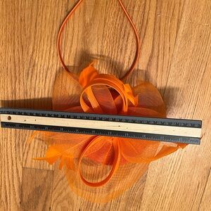 Elegant orange fascinator with mesh and feather details. Perfect for special occasions.