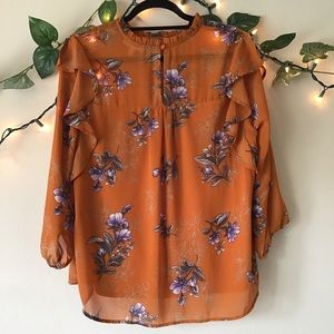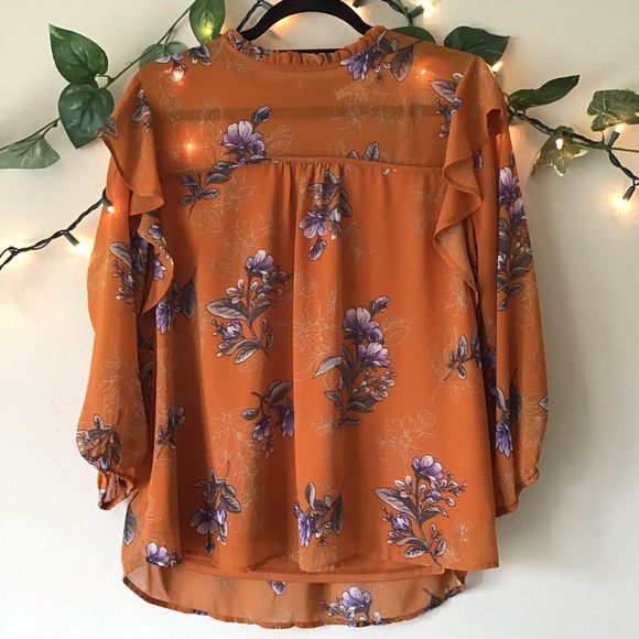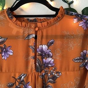 Gorgeous orange blouse with a purple and gray floral print! The top is sheer at the sleeves and upper neck and upper back but is lined throughout the body with cute ruffle detail along the neckline and at the shoulders! The blouse also features a button keyhole closure at the back and gathered 3/4 sleeves!