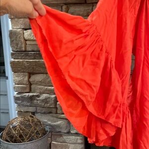 This vibrant orange blouse features elegant flutter sleeves and a relaxed, ruffled design. The lightweight fabric drapes beautifully, offering a comfortable and stylish fit. Perfect for adding a touch of bohemian flair to your wardrobe. Elastic neck allows you to also wear off shoulder. Tagged “one size” I’m a small - medium and fits perfectly