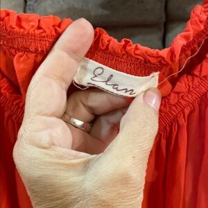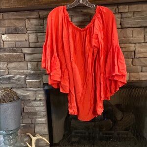 This vibrant orange blouse features elegant flutter sleeves and a relaxed, ruffled design. The lightweight fabric drapes beautifully, offering a comfortable and stylish fit. Perfect for adding a touch of bohemian flair to your wardrobe. Elastic neck allows you to also wear off shoulder. Tagged “one size” I’m a small - medium and fits perfectly