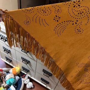 Stylish orange poncho featuring faux suede with fringe detailing. Perfect for adding a pop of color to your wardrobe. Perfect for any occasion.