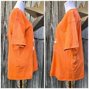 Orange tee w/ graphic print. Short sleeves, crew neck, pullover shirt. Front has a fishing boat named Maureen Jane & map of a trip/move from Portsmouth, New Hampshire to Wanchese, North Carolina. Obscure & unique print. Back is plain. Issues noted in photos. The camera didn't pick up the fading very well: faded across shouders & top half of sleeves. No fabric content/care, size or brand labels present. Listing as a men's size large. Please see measurements for fit.