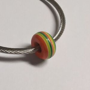 Orange Green Yellow Striped Charm for Pandora Style Bracelet good condition Brand Unknown, not Pandora Brand can be used for any bracelet similar to Pandora, Chamilia, Trollbeads and European Charm Bracelets, Necklaces, Keychains, or Designable Pens