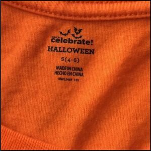 Lightweight orange short sleeved tshirt. Black cat silhouette sitting on a gold shiny moon, white cloud and stars and a vine. Excellent new without tag condition. Very soft and stretchy. Printed Celebrate Halloween tag size S (4-6).